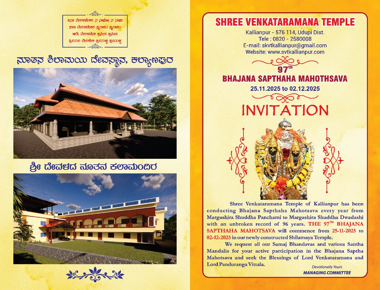 The Bhajana Sapthaha Mahotsava is held in SVT Kallianpur from Marghashira Shuddha Panchami to Marghashira Shuddha Dwadashi. It is strongly believed in our mythology that the Marghashira mhaasa is the holiest and a prominent month in the Hindu calendar. This 7-day non-stop program is celebrated at the lotus feet of Lord Vitobha and Goddess Rukhmai and the presiding deity Lord Venkataramana. It may be noted that the Bhajana Sapthaha Mahotsava started in the year 1929 with the blessings of Lord Venkataramana and the revered mathadeepathis of our samaj. The first ever Bhajana Sapthaha Mahotsava was ably led by Sri K Ramakrishna Kini, Sri T Pattu Panduranga Kini, Sri Raghavendra Prabhu and Sri Malpe Vaman Bhat. They were ably supported by Sri Ammujne Raghavendra Nayak who sponsored Kaaludeepa, Sri Manjunath Baliga who sponsored Deepada atte, Sri Kallikote Venkatesh Shenoy who sponsored kannadi (mirror), Sri Kagal Vamana Pai who sponsored Vitoba Rukumayi murthi and, Sri Krishnaraya Sadashiva Padiyar, Sri Laxman Shenoy, Sri Ramachandra Mallya, Sri K Ramachandra Shenoy and Sri K Ramachandra Baliga.