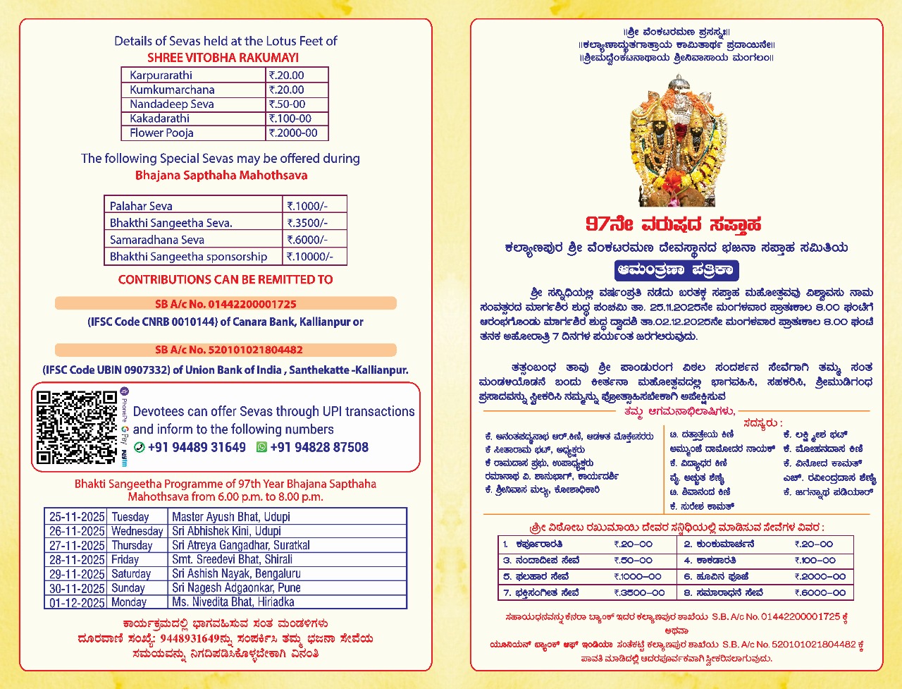 One special highlight of Bhajana Sapthaha is the ‘Bhakti Sangeet’ program held from 6 to 8 pm on all the 7 days where many eminent vocalists offer their seva at the lotus feet of the Lord. All the major bhajane mandalis from Dakshina Kannada, Uttara Kannada and Kerala participate also offer their seva and get blessings from Vitobha Rukmayi. On each day of the Sapthaha at 4 am in the morning, the devotees witness the Kakadarthi pooja , which gives a blessed feeling as if one is in the real sacred place of Vitobha Rukmayi – Pandharpur. For all the devotees that participate in Bhajana Sapthaha, there is Mahasamaradhane on 6 days, phalhaar on Ekadashi day and phalhaar each day after 5 pm in the evenings. The sapthaha mahotsava concludes on Marghashira shuddha Dwadashi Geeta Jayanti which involves Avabratotsava and Mahasamaradhane.